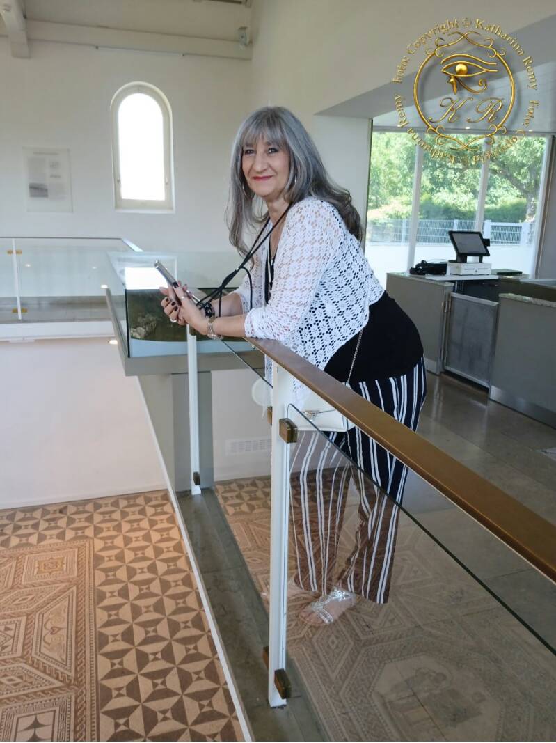 Heute ist der antike Boden durch ein modernes Schutzhaus, in welchem sich gleichzeitig die Kasse und der Einlaß befinden, gut geschützt. Und natürlich lasse ich es mir nicht nehmen, mit Hilfe meines 3D-Programms eine Szenerie zu erstellen, bei der man erahnen kann, wie prächtig alles einst ausgesehen und mit welchem Liebreiz die Dame des Hauses den Besucher bei Tag oder Nacht empfangen haben mag.