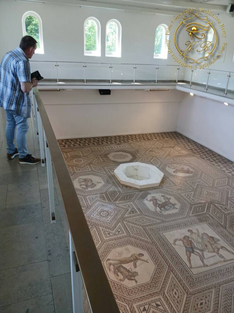 Der zentral gelegene, 15,65 × 10,30 m große Fußboden schmückte einst den repräsentativen Eingangsbereich des im 1. Jahrhunderts n. Chr. gegründeten Latifundium. Nahezu 3 Millionen Mosaiksteinchen (ungefähr 1x1 cm) bilden einen grandios anzuschauenden Fußboden mit 9 – davon sind 7 erhalten – Bildern des römischen Gesellschaftslebens; Gladiatorenkampf, Theater, Tierkampf, Musiker.