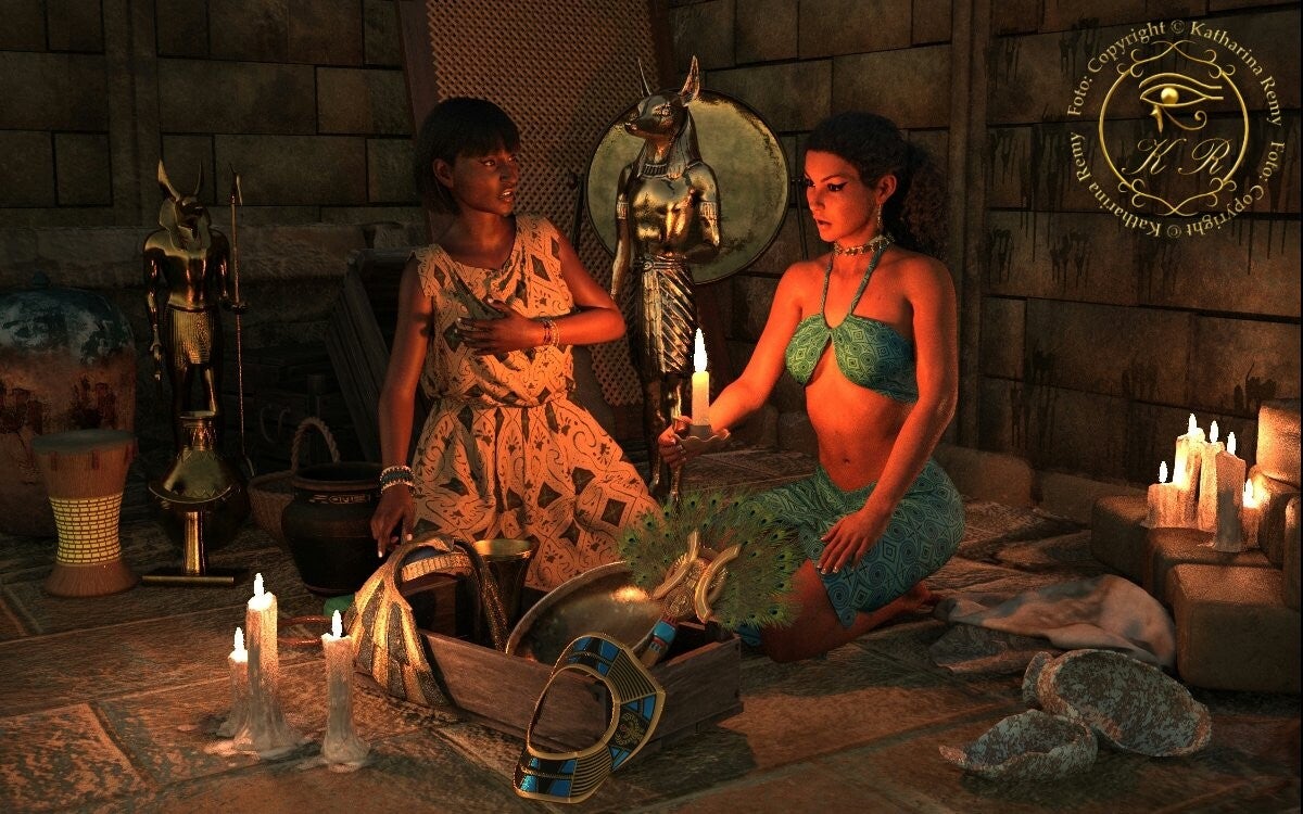 … In der gespenstischen Stille hörte man einzig Chnemets spitzes Lachen und ein nerviges Klackern, als würde eine Musikantin mit ihren Klappern spielen. Chufu packte Meritites grob am Arm.